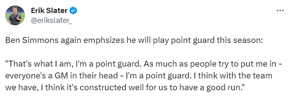 数据显示,上赛季,西蒙斯只有25%的时间在控卫的位置上,另外71%的时间打得分后卫,4%的时间打小前锋。而生涯至今,西蒙斯有78%的时间在控卫上。显然,他渴望重新回到自己最熟悉的位置,来主导球队的进攻。