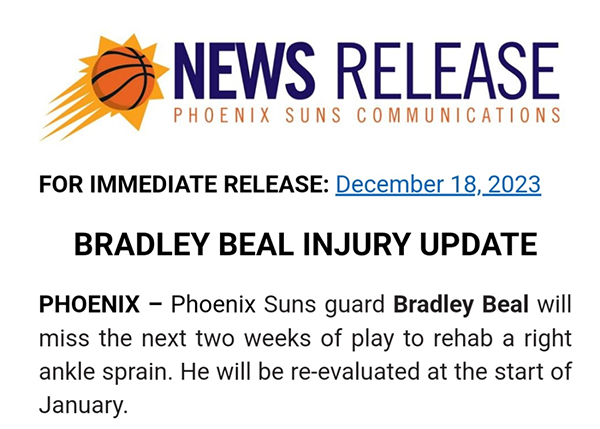 以上就是关于《太阳官方:比尔将缺席后面两周所有比赛 将在1月初重新评估》最新新闻详细内容介绍,想要了解更多有关篮球的资讯请关注牛叉NBA录像网(www.nxnba.com)!!!