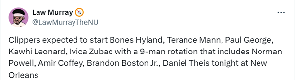 以上就是关于《哈登缺席第二战!快船9人轮换对决鹈鹕:海兰德首发闪耀》最新新闻详细内容介绍,想要了解更多有关篮球的资讯请关注牛叉NBA录像网(www.nxnba.com)!!!