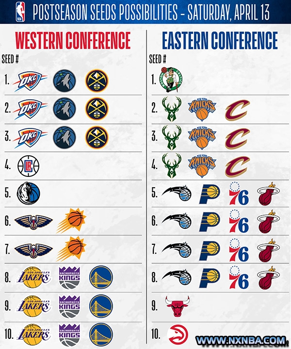 到目前为止,西部只有快船(西部第4)和独行侠(西部第5)锁定排名,东部则是只有凯尔特人(东部第1)、公牛(东部第9)和老鹰(东部第10)锁定排名,其他15队都将血拼到底。