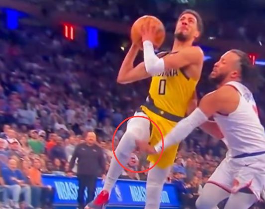 慢镜头显示,布伦森是在一次防守哈利伯顿的上篮时意外受伤。当时,布伦森尝试打掉哈利伯顿手中的球,但他的手却挥到了哈利的膝盖上,而当时哈利正在上篮抬腿,布伦森的左手意外受伤。尼克斯官方随后宣布,布伦森因左手骨折退出这场比赛。