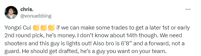 “崔永熙(三个鼓掌表情包)如果我们能通过交易获得第一轮后期或第二轮早期的选秀权,他就是不错的目标。我不知道第14顺位(该不该用来选他)。我们需要射手,而这家伙太棒了!这兄弟身高6英尺8英寸(2米03),是前锋,不是后卫。他应该被选中,他是你的球队想要的球员。”