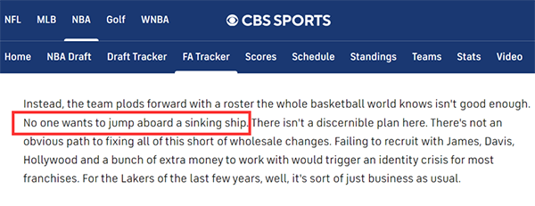 CBS名记Sam Quinn在解析紫金军团的引援困局时,给出了一些很犀利的评价。他认为这支球队近年来屡屡成为马戏表演,教练接二连三地被解雇,管理层则持续逃避球队失利的责任。Quinn指出湖人没有一个明晰的计划,球队的阵容也和上赛季没啥重要区别。“没有人想跳上一艘正在下沉的船。”