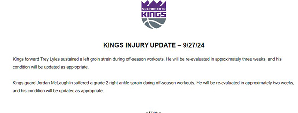 国王官方表示,球队前锋特雷-莱尔斯在休赛期训练中左腹股沟拉伤,他将在大约三周后重新接受评估,球队将酌情进行更新。此外,球队后卫乔丹-麦克劳林在训练中遭受右脚踝2级扭伤,将在大约两周后接受重新评估。