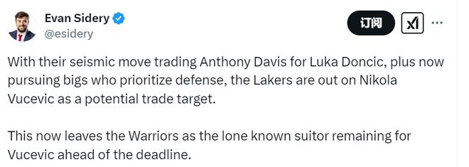 考虑到现有阵容的需求,湖人已经把目标放在这些防守能力突出的五号位上。Sidery表示,这也意味着湖人不再追求武切维奇,这样一来,勇士就成为了截止日前唯一已知还在追求武切的球队。