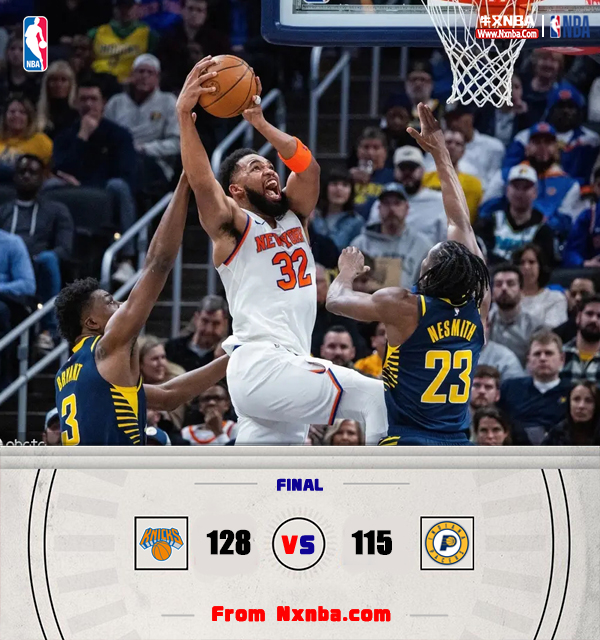 末节,沙梅特空切打进,谢泼德三分命中,尼克斯这边进攻总能做出回应,依然占据场上主动,唐斯突破打进,沙梅特三分命中,佩恩反击打进,取得110-95领先。步行者之后无力追赶,比赛就此失去悬念,最终尼克斯128-115击败步行者。